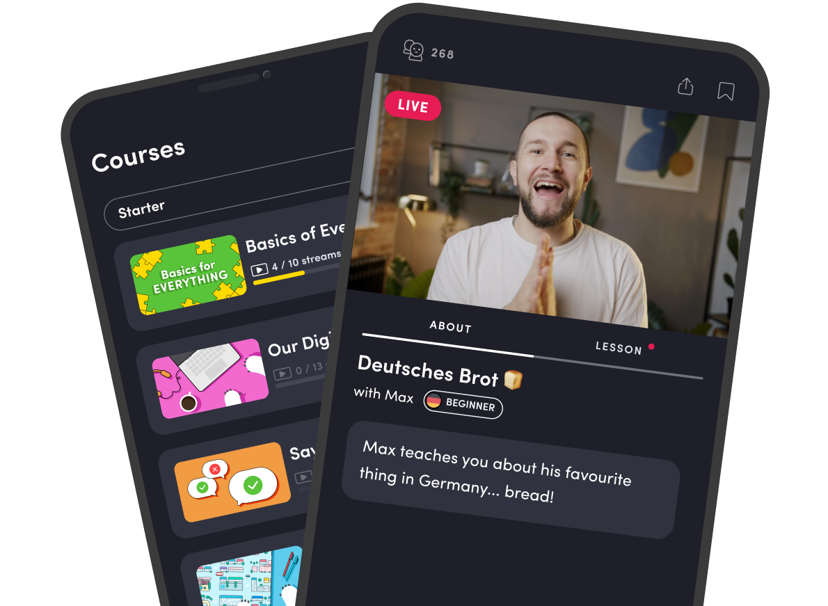 Watch live or catch up laterWatch bite-sized interactive live streams in the app and chat with other language learners. You can also watch a stream back whenever it suits you. Each stream is presented by our encouraging native speaking streamers and based on a unit from the accredited Chatterbug curriculum.